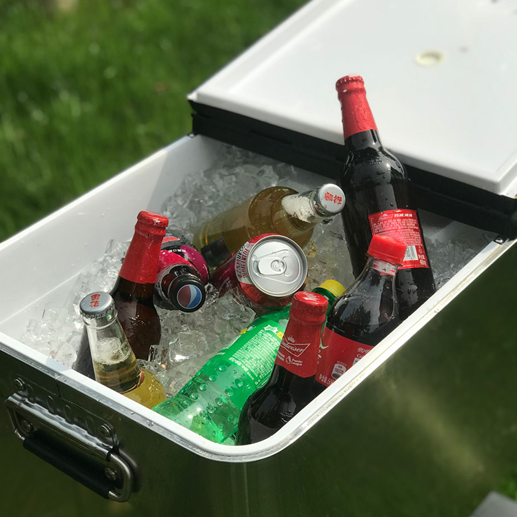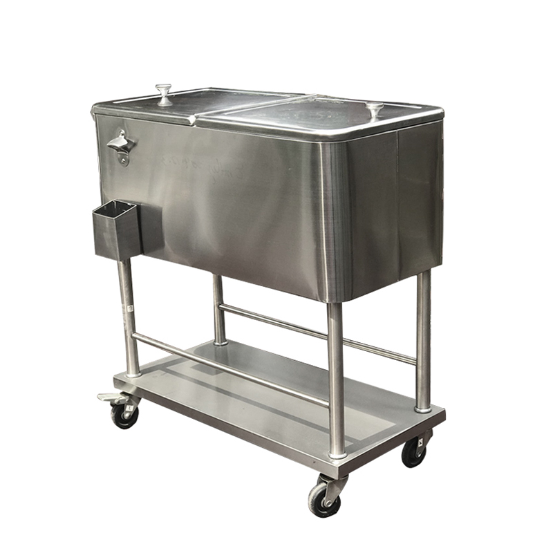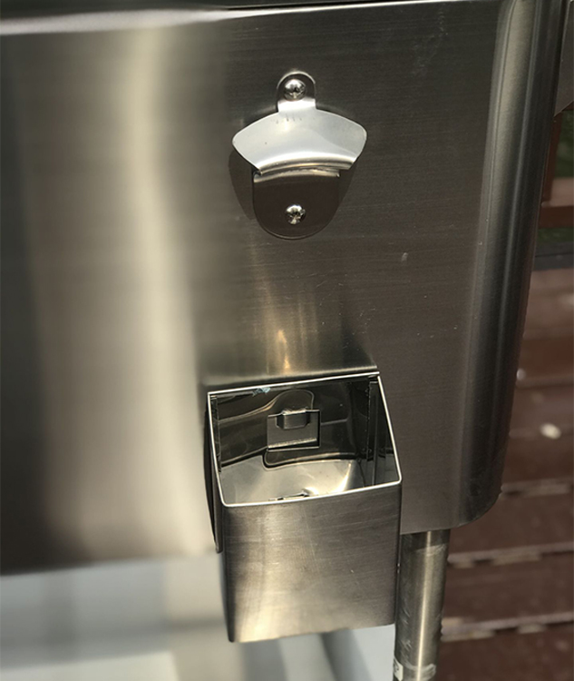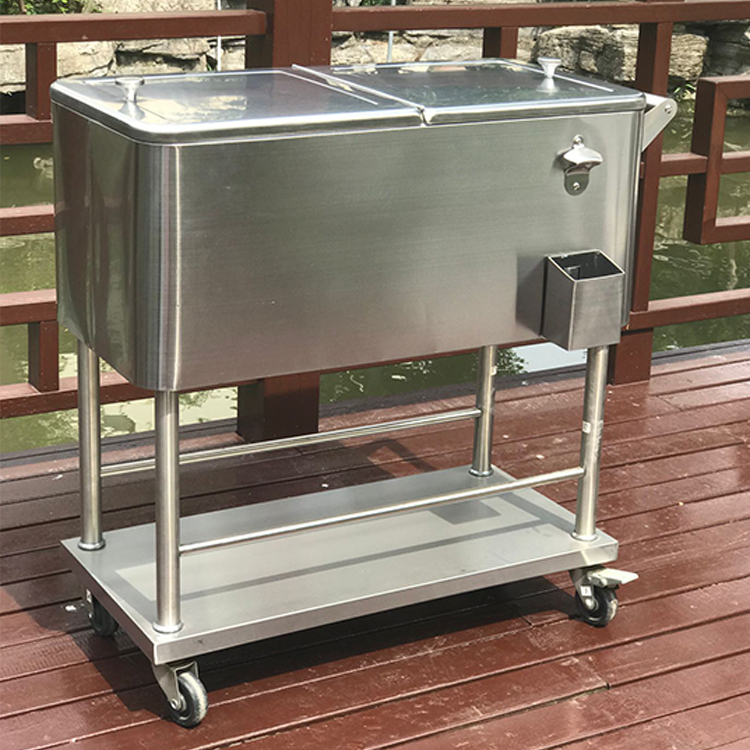 Este cooler para festas com rodinhas é feito de aço inoxidável e possui um acabamento colorido elegante que combina perfeitamente com seu espaço externo. O cooler de 80 litros, projetado com capacidade para até 100 latas ou 50 ou mais garrafas, possui duas aberturas para que você possa acessar facilmente suas bebidas de ambos os lados. Há também alças práticas que facilitam puxar ou carregar o carrinho com uma pessoa. Este modelo também possui um orifício de drenagem na parte traseira que remove o excesso de água. Além disso, ele foi projetado com um abridor de garrafas e um coletor de tampinhas para melhor funcionalidade.