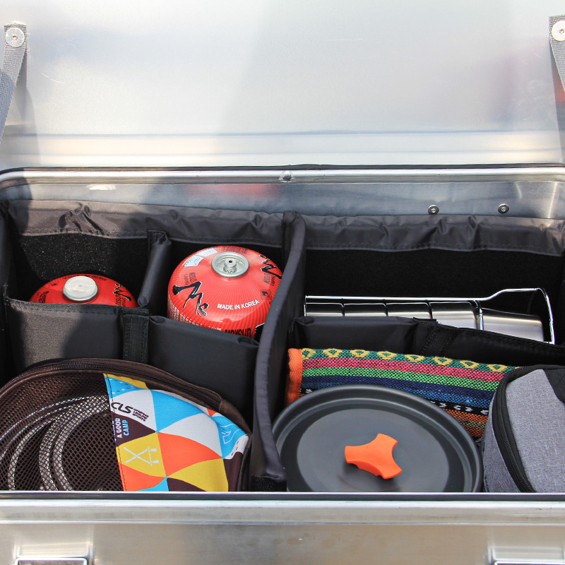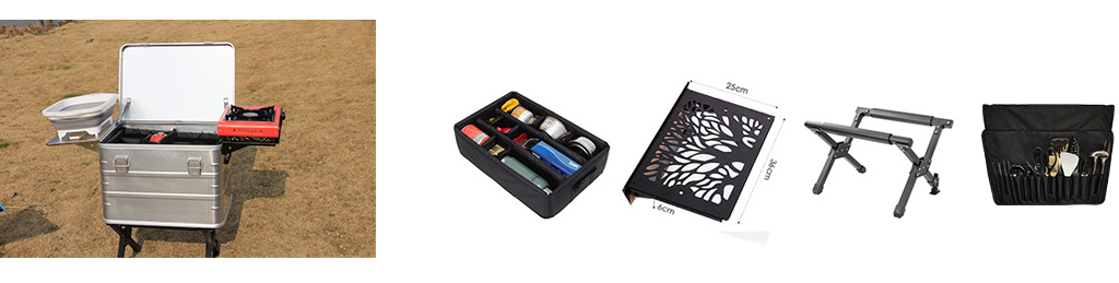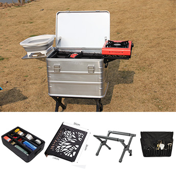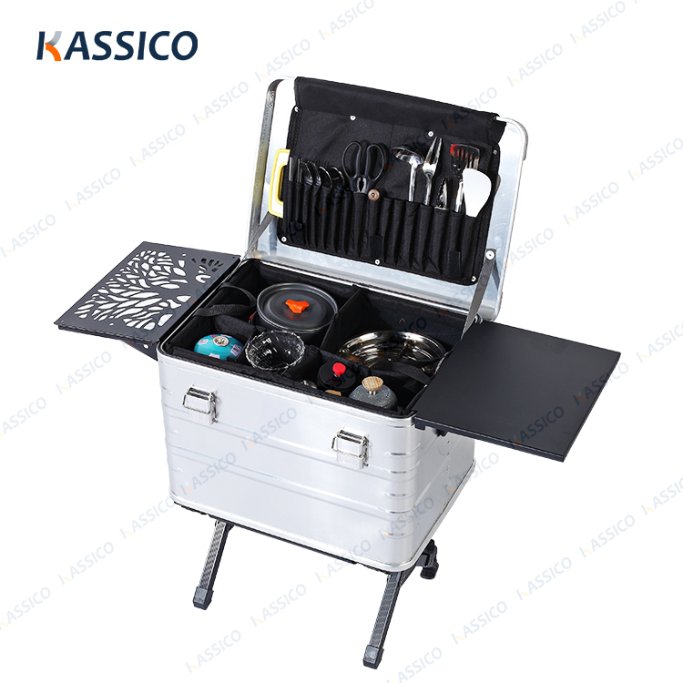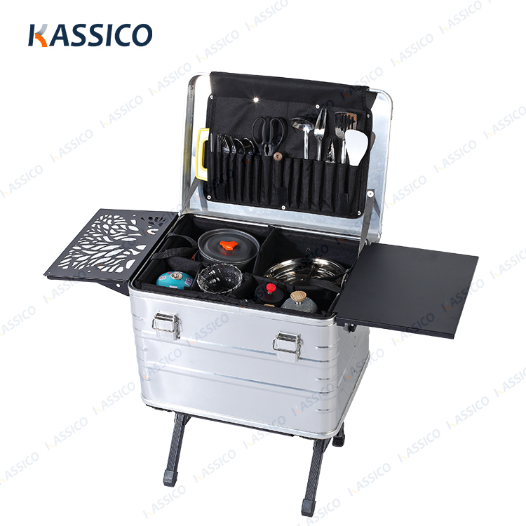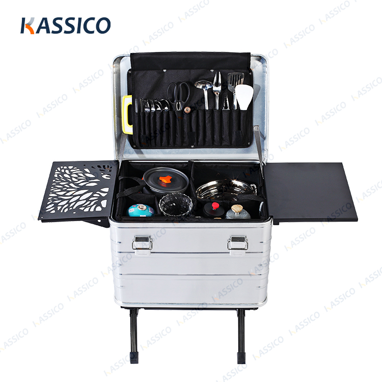 A caixa da série K da KASSICO é uma caixa de cozinha móvel portátil para áreas externas, toda em alumínio, que integra caixa de alumínio, tábua de passar roupa, fogão, utensílios de cozinha, louças e outros suprimentos, tudo em uma única caixa, podendo ser usada para cozinhar ao ar livre e armazenar equipamentos de acampamento. A caixa de cozinha móvel é o complemento perfeito para sua barraca de teto e a companheira de viagem ideal para um piquenique, no barco ou no carro. Com esta caixa de cozinha móvel, você terá tudo o que precisa para preparar seu café da manhã, almoço ou jantar de forma rápida e fácil, onde quer que você vá e faça o que quiser.